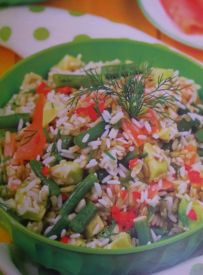 Juntar o arroz em uma saladeira e unir a vagem, o salmão, o abacate e dê sabor com a cebolinha picada, e um pouco de folhas de erva doce picada.